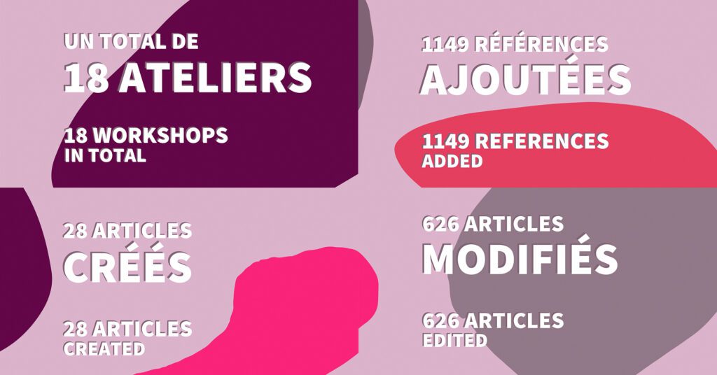En présentiel ou en virtuel, pour les ateliers Wiki ou d’archivage du web, ARTEXTE, le RCAAQ / Réseau Art Actuel, le REPAIRE – arts indépendants de recherche et d’expérimentation et les organisatrices, Hélène Brousseau et Isabelle L’Heureux, tiennent à remercier tou.te.s les participant.e.s, ainsi que les 116 éditeur.trice.s wikipédien.ne.s.