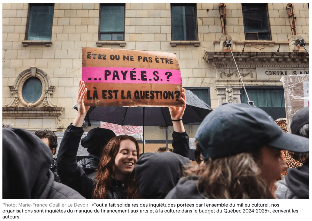Tout à fait solidaires des inquiétudes portées par l’ensemble du milieu culturel, nos organisations sont inquiètes du manque de financement aux arts et à la culture dans le budget du Québec 2024-2025. Cette absence de fonds substantiels a un effet retentissant sur l’ensemble des artistes, artisans, artisanes, travailleurs et travailleuses culturels de nos secteurs, et sur la survie même des organismes qui les soutiennent.