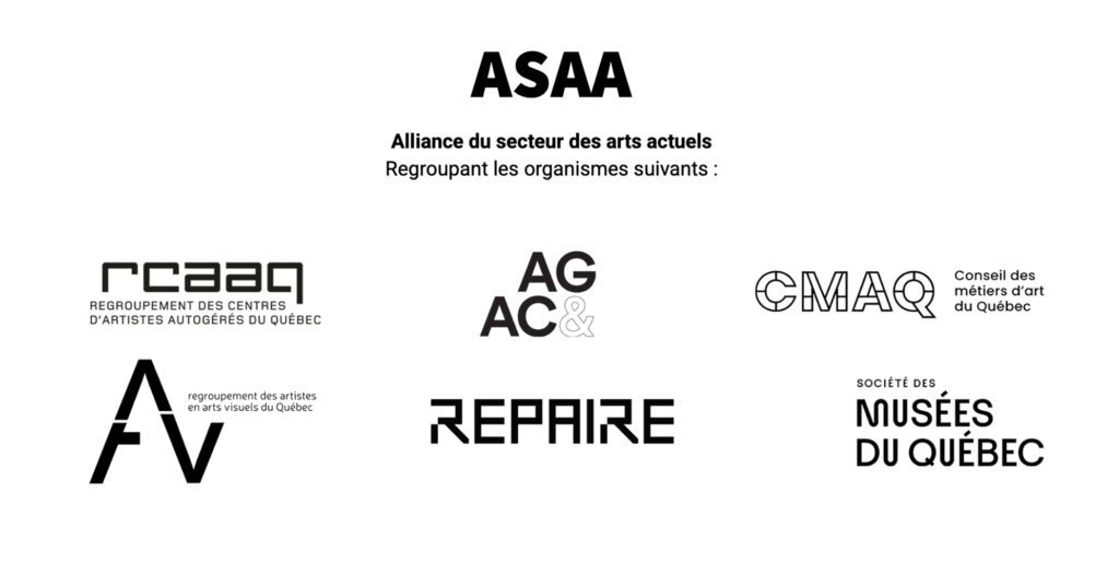 L’Alliance du secteur des arts actuels (ASAA) réunit six regroupements nationaux et associations professionnelles québécoises — l’Association des galeries en art contemporain (AGAC), le Conseil des métiers d’art du Québec (CMAQ), le Regroupement des artistes en arts visuels (RAAV), le Regroupement des centres d’artistes autogérés du Québec (RCAAQ), le Regroupement de pairs des arts indépendants de recherche et d’expérimentation (REPAIRE) et la Société des musées du Québec (SMQ). Ensemble, ils représentent un milieu diversifié composé d’artistes, de collectifs, de professionnel·le·s des arts et d’organismes engagés dans la recherche, l’expérimentation, la production, la diffusion et la promotion des arts actuels au Québec. Ces acteurs contribuent collectivement à façonner un écosystème effervescent, nourri par des pratiques et collaborations audacieuses, et offrant un rayonnement artistique essentiel au développement culturel de la société québécoise.